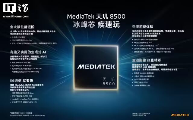 今天(1月15日),2026联发科天玑芯片新品发布会举行,首先带来的是天玑8500芯片。
