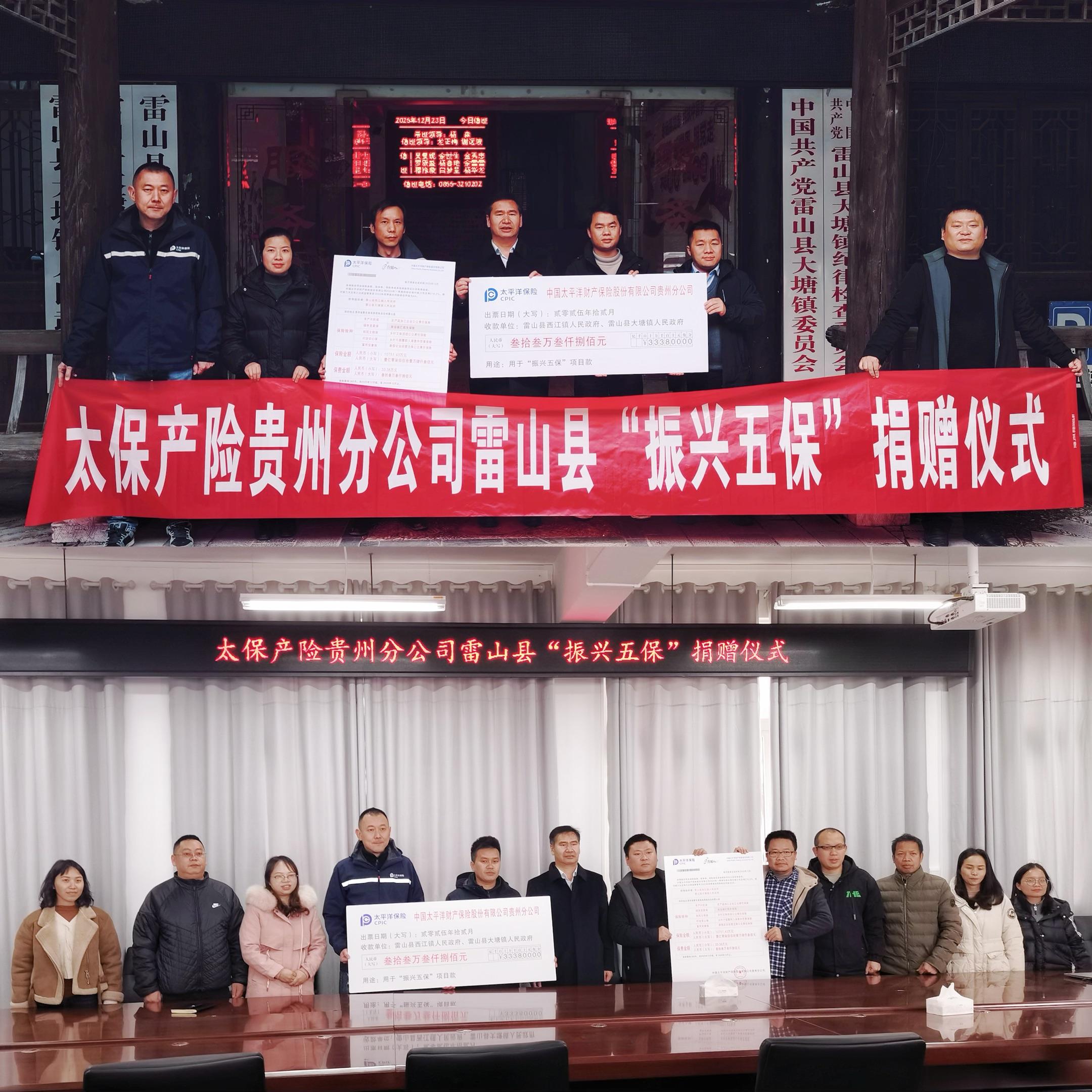 多彩贵州网讯(记者 王静怡)近日,中国太保产险贵州分公司携下辖黔东南中心支公司,走进黔东南苗族侗族自治州雷山县,开展“振兴五保”专项捐赠活动,向大塘镇和西江镇捐赠33.38万元资金,并创新保险保障模式,为当地筑牢总额达1.07亿元的风险防护网,全方位助力乡村产业升级、治理优化与民生改善。