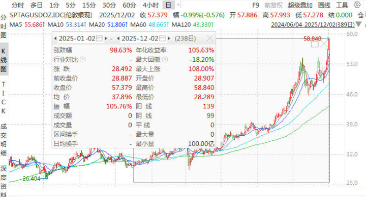 Wind显示,隔夜伦敦银现的历史最高价格达58.840美元/盎司,现报57.352美元/盎司。年内,现货白银涨幅近99%,显著高于年内伦敦金现的涨幅。
